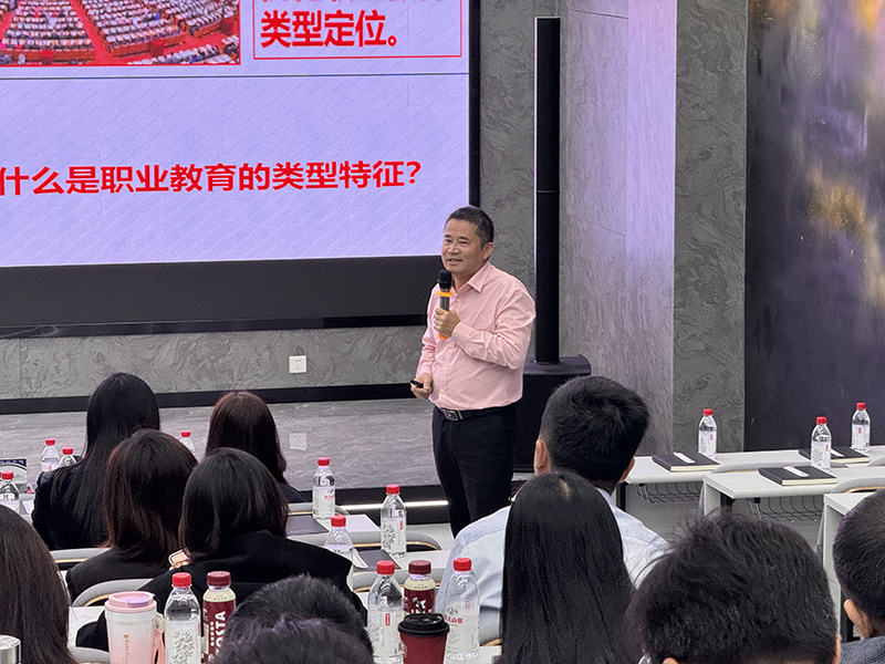 上午的培训特邀中国首届职业院校教学名师、教育部新时代中职学校名校长培养对象、中山市中等专业学校党委书记龙卫平主讲。他以《“四跟四在”理念下职业学校人才培养模式——用“职业教育类型特征”思维构建职业教育新模式》为题,结合职业教育发展实际,从“四跟四在”理念的产生背景切入,深入阐述理念的核心内涵与理论支撑,并通过典型案例,生动展示该理念在职校人才培养中的应用成效。理论深度与实践指导性的有机融合,让参训校长们对职业教育类型特征下的人才培养新模式有了更清晰的认知。