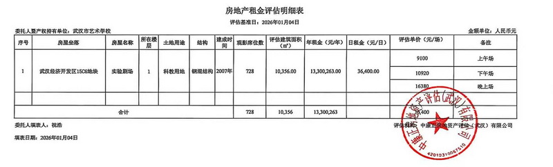 按财政部门相关文件要求,我校聘请武汉中康正房地资产评估(武汉)有限公司对学校实验剧场租金市场价值资产进行评估。现将武汉市艺术学校实验剧场租金评估明细表公告如下:
