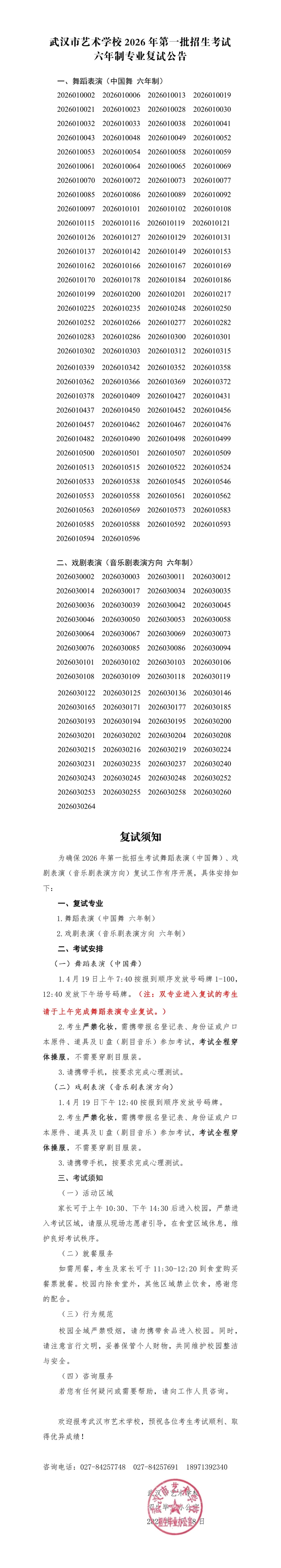 武汉市艺术学校2026年第一批招生考试 六年制专业复试公告